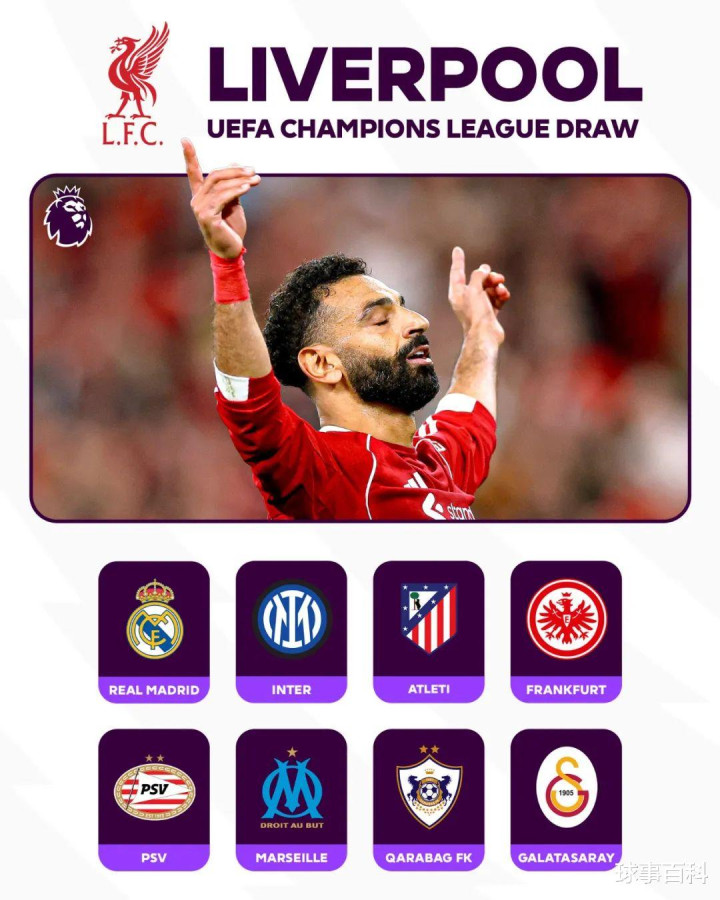利物浦:皇马(主)、国米(客)、马竞(主)、法兰克福(客)、埃因霍温(主)、马赛(客)、卡拉巴赫(主)、加拉塔萨雷(客)