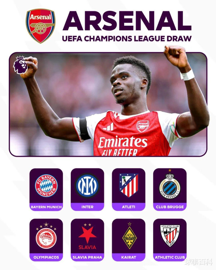 阿森纳:拜仁(主)、国米(客)、马竞(主)、布鲁日(客)、奥林匹亚科斯(主)、斯拉维亚(客)、阿拉木图凯拉特(主)、毕尔巴鄂竞技(客)