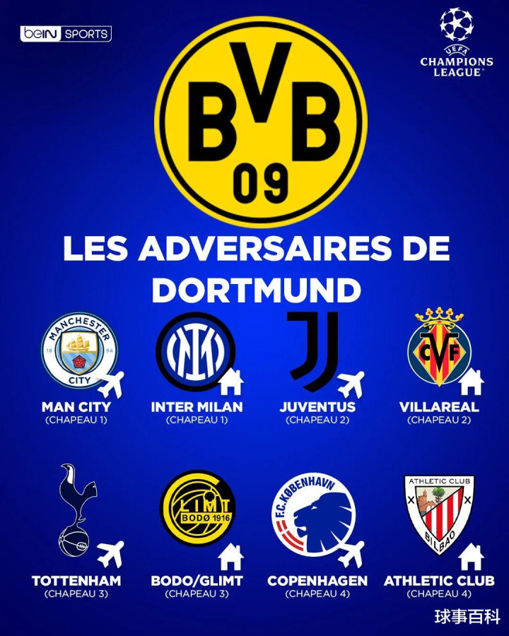 多特蒙德:国米(主)、曼城(客)、比利亚雷亚尔(主)、尤文图斯(客)、博德闪耀(主)、热刺(客)、毕尔巴鄂竞技(主)、哥本哈根(客)