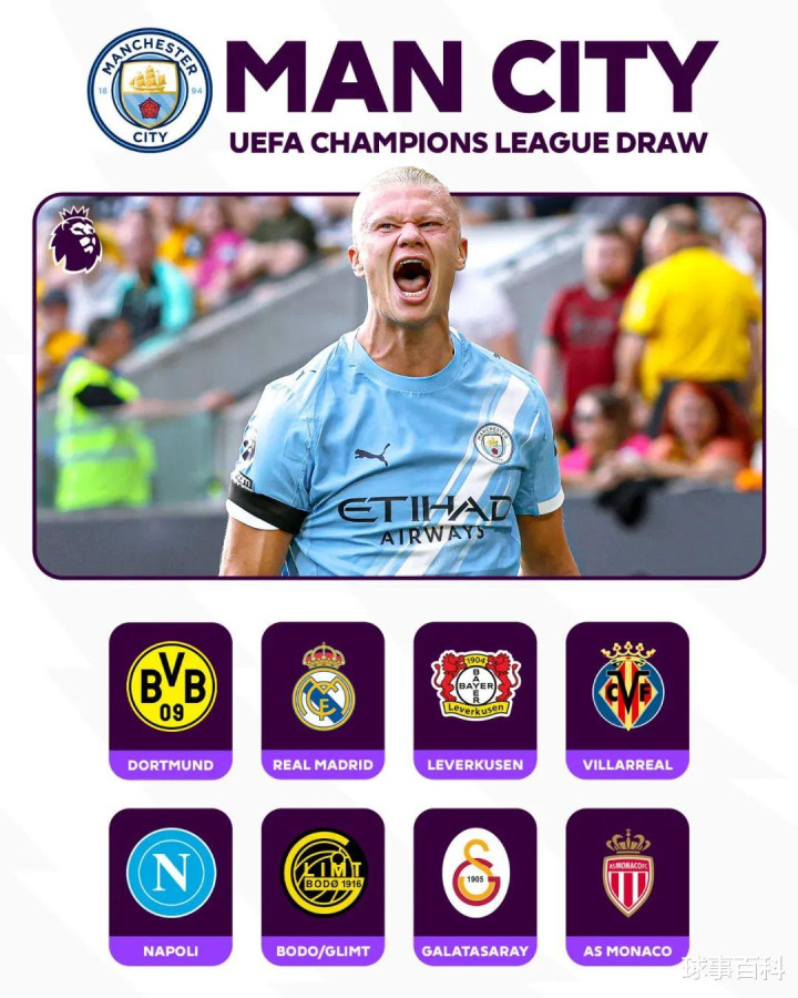曼城:多特(主)、皇马(客)、勒沃库森(主)、比利亚雷亚尔(客)、那不勒斯(主)、博德闪耀(客)、加拉塔萨雷(主)、摩纳哥(客)