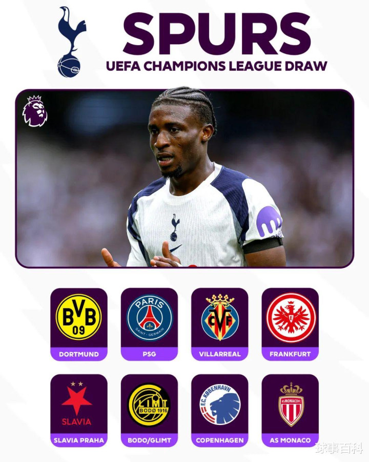 热刺:多特(主)、巴黎(客)、比利亚雷亚尔(主)、法兰克福(客)、斯拉维亚(主)、博德闪耀(客)、哥本哈根(主)、摩纳哥(客)