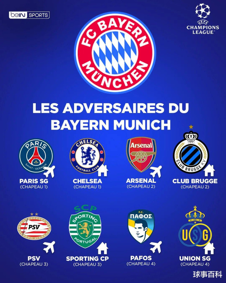拜仁慕尼黑:切尔西(主)、巴黎(客)、布鲁日(主)、阿森纳(客)、葡萄牙体育(主)、埃因霍温(客)、圣吉罗斯(主)、帕福斯(客)