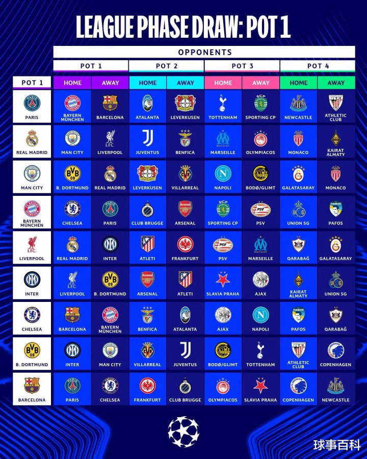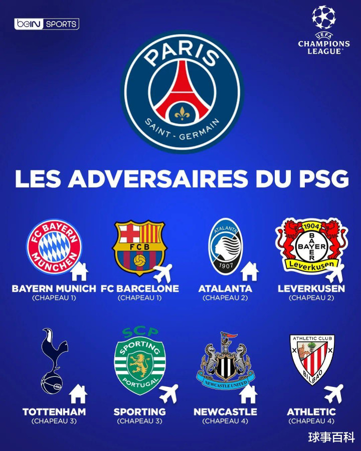 巴黎圣日耳曼:拜仁(主)、巴萨(客)、亚特兰大(主)、勒沃库森(客)、热刺(主)、葡萄牙体育(客)、纽卡斯尔(主)、毕尔巴鄂竞技(客)