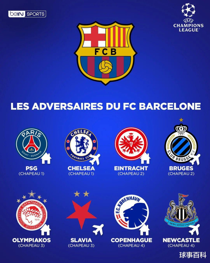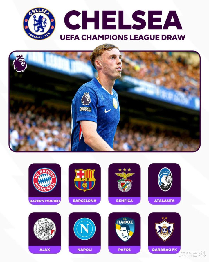 切尔西:巴萨(主)、拜仁(客)、本菲卡(主)、亚特兰大(客)、阿贾克斯(主)、那不勒斯(客)、帕福斯(主)、卡拉巴赫(客)